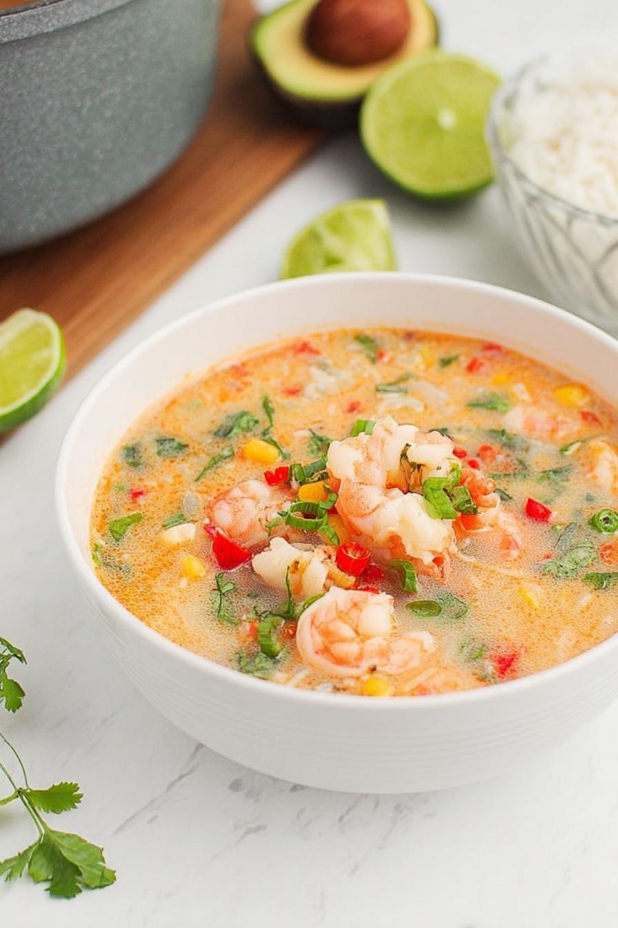 Fridge 2-3 days sealed well, seafood best eaten sooner. Reheat gently, low stove or microwave in bursts to avoid rubbery seafood. Freeze not advised; texture breaks, coconut milk separates. Fresh lime juice freshens again after storage.