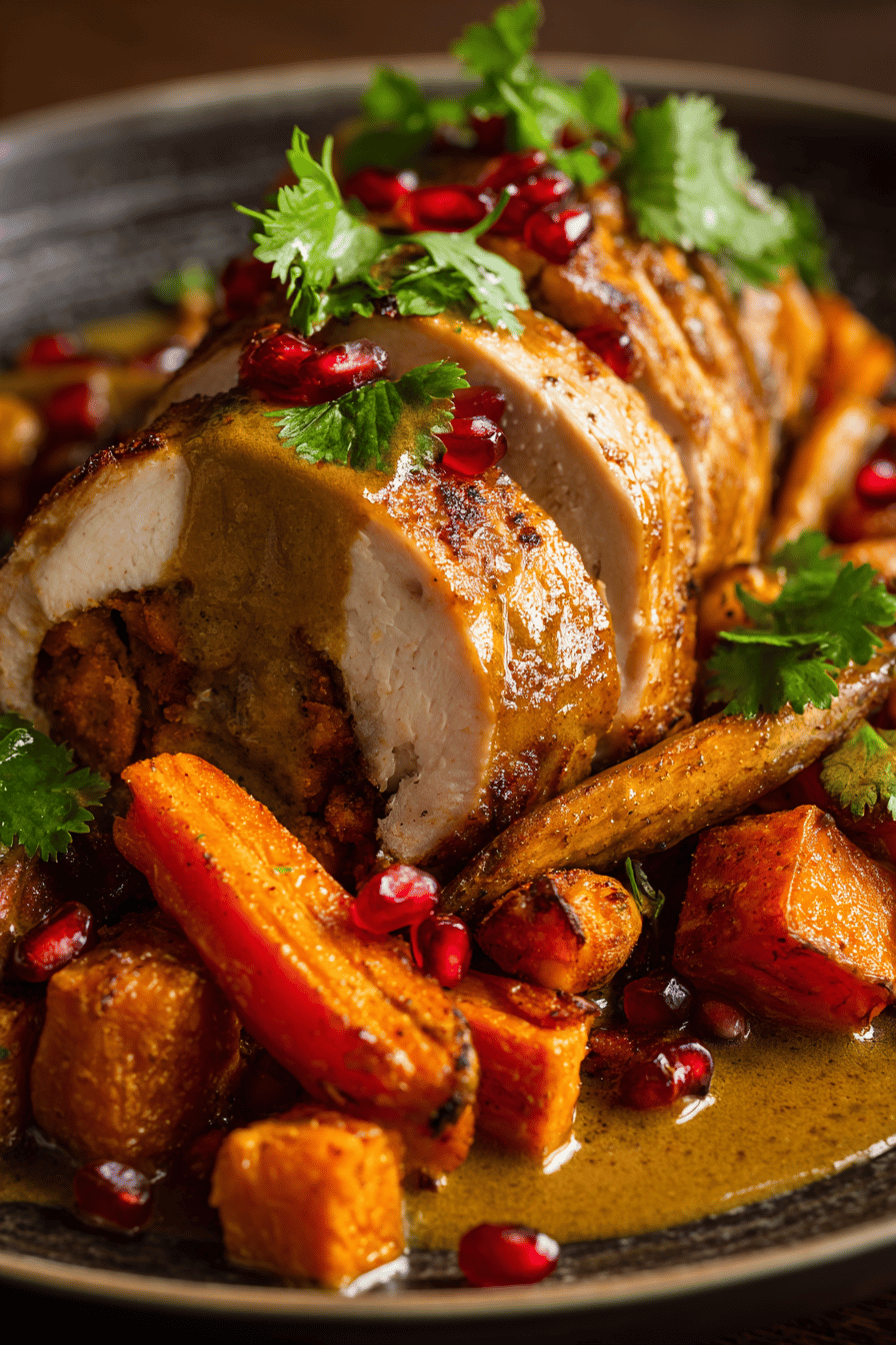 Turkey roast stuffed with a fragrant spiced onion-raisin mix. Roasted with colorful carrots, sweet potatoes, chickpeas, and a tangy marinated onion salad. Finished with a thickened curry-infused chicken broth sauce. Cooking times adjusted for even roasting and thorough flavor melding. Yield serves six to eight. Two spice swaps swap garam masala for cumin and curry powder for smoked paprika, adding a smoky warmth twist. Oil quantities slightly altered; cooking steps reordered to accommodate stuffing prep before roasting. Sauce thickened with cornstarch dissolved in chicken broth. Garnished with fresh coriander leaves and tangy pomegranate seeds to brighten.