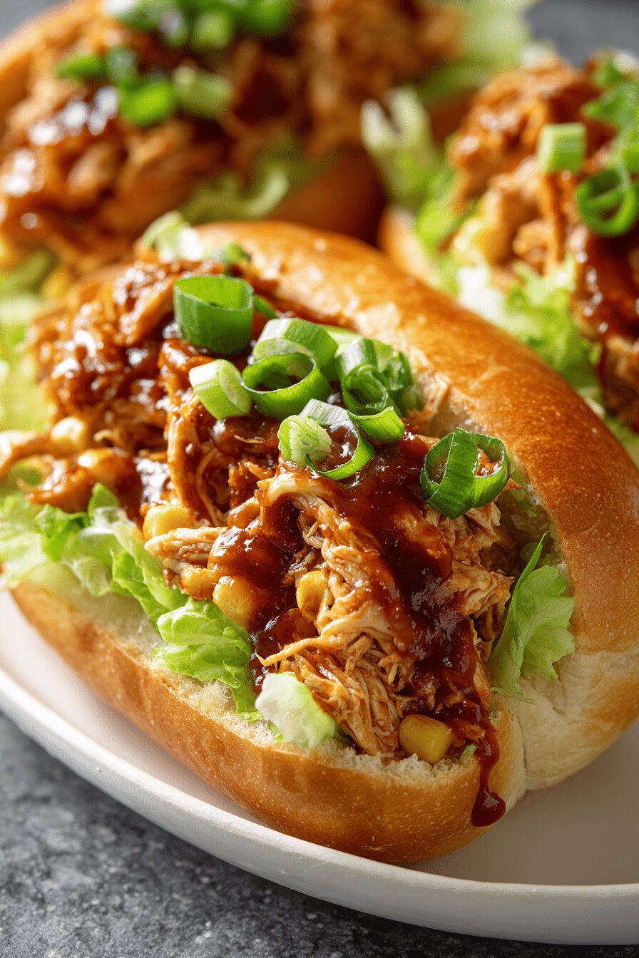 Chicken pulled, corn mixed, sharp onion and celery chopped. Spicy barbecue sauce simmers down with butter, ketchup, tangy vinegar, a dollop of apple jelly—sweet twist. Mustard punches in, Worcestershire makes it complex. Mayonnaise turns spicy with chili powder, not too much. Submarine buns soft and tender. Leafy crunch in there. Salt and pepper tweak each bite. Time around fifty minutes total. Four to six sandwiches come together. Warm sauce coats chicken, wait till it thickens. Cool slightly, spread mayo, pile in chicken filling, lettuce crisp and cool. Hands get messy fast. Good sandwiches, no fuss. Mismatched heat with sweet but brings bite and juicy bites. Lunch or dinner done.
