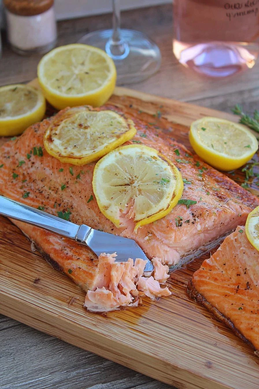 Soak the cedar plank first — minimum an hour, up to two. This part matters. You’ll hear it pop and sizzle on the grill instead of catching fire, which changes everything. The smoke gets sweet, not acrid. Salmon gets a whisper of cedar instead of char.