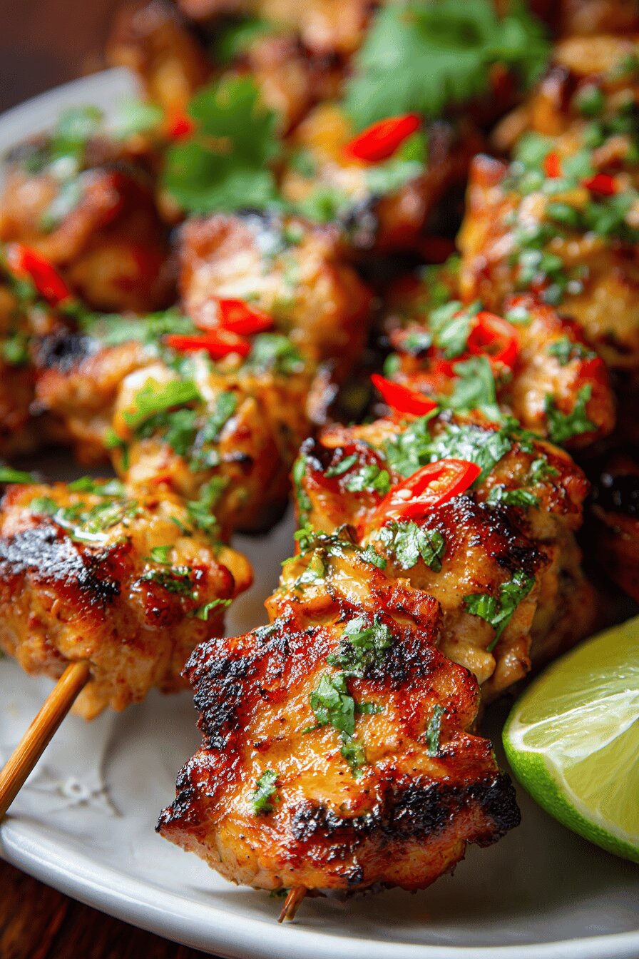 Chicken thighs marinated in a tart and buttery mix, grilled on skewers over medium heat until spotting char and juicy inside. Uses lemon juice, melted butter, smoked paprika, garlic, and fresh chillies with altered quantities. Heat balance adjusted, with saffron replacing paprika for earthiness and lime juice in place of lemon for sharper acidity. Quick marinade, grill, and serve. No nuts, dairy, gluten, or eggs. Result is smoky, tender, and bright, with smoky undertones and a subtle bite. Easy for backyard barbecues or weeknight dinners.