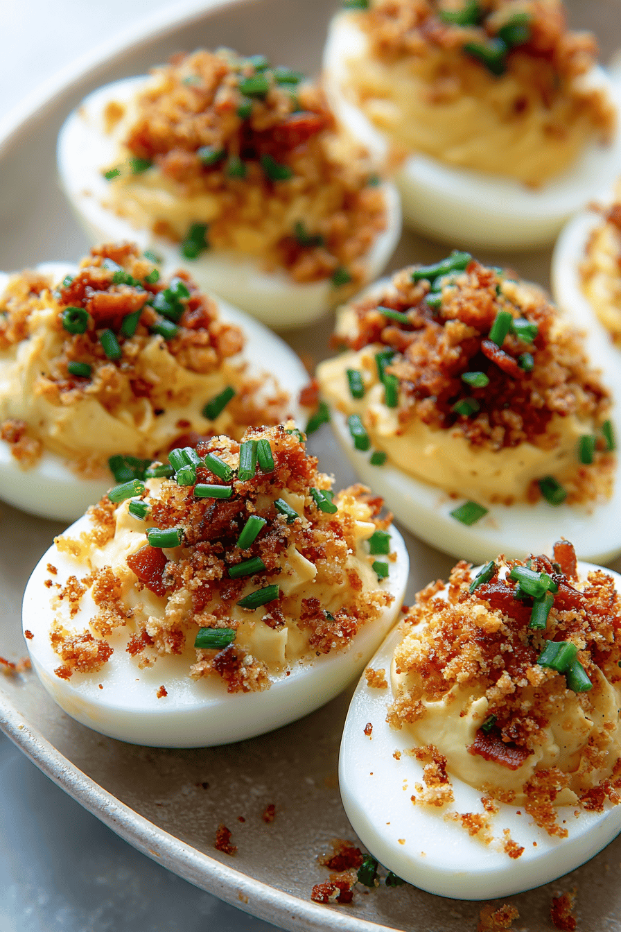 Half dozen eggs cooked, peeled, and halved. Yolks mashed with mayo, Dijon mustard, chives. Bacon crisped, finely chopped. Panko breadcrumbs toasted with chipotle powder and a dash of cayenne mixed with sriracha for heat. Eggs filled with creamy yolk mix then rolled in spicy crunchy topping. Chilled until serving, garnished with fresh chives. A crunchy twist on classic deviled eggs with smoky, spicy notes. No gluten, dairy, or nuts.