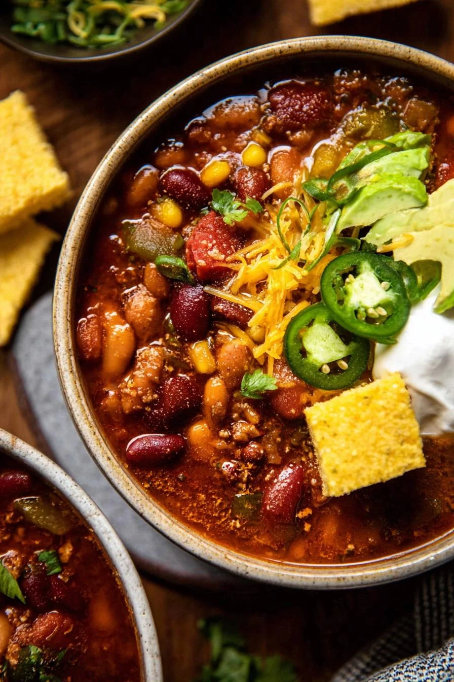 - 6 Serve piping hot with corn bread. Garnish how you like: shredded cheese, chopped onions, sour cream, diced avocado. The toppings cut heat or add creaminess. Watch for chili thickness; add broth if too dense. Leftovers get better holding flavors. Keeps well in fridge or freezer.