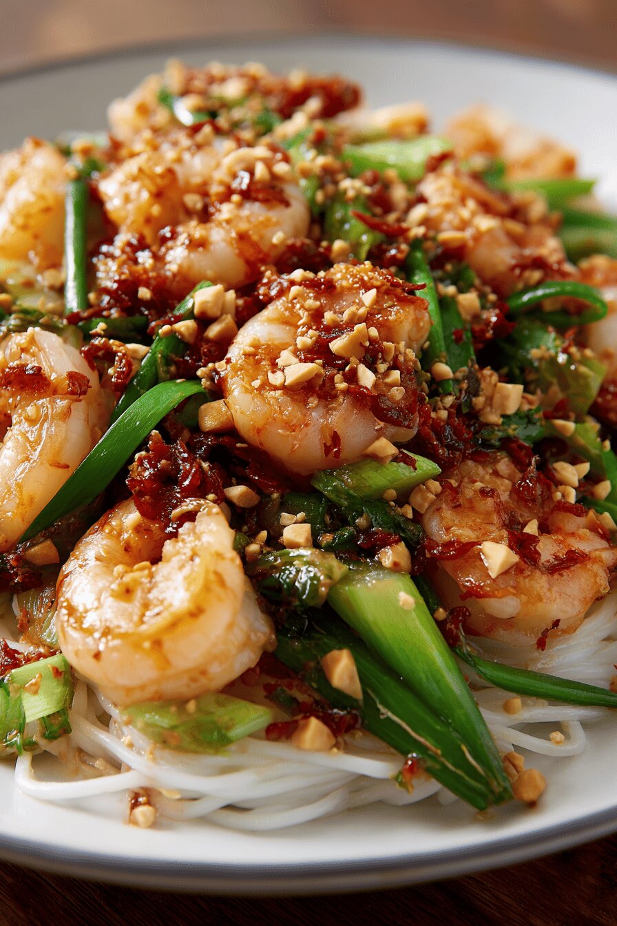 Scallions divided white and green, different functions—white for softening the base, green to finish for freshness. Garlic and fresh ginger add aromatic depth. Vegetable oil for initial sauté, neutral flavor. Kimchi ripe or homemade, must have that fermented punch. Honey instead of sugar provides caramel notes and balances acidity. Shrimp small, peeled, deveined, easy to cook evenly. Toasted sesame oil added near end to maintain aroma. Peanuts replace sesame seeds here for texture contrast, crushed, not whole, to avoid overwhelming bites. Adjust oil amounts slightly depending on pan size and heat source. Best fresh, but kimchi can be refrigerated weeks.