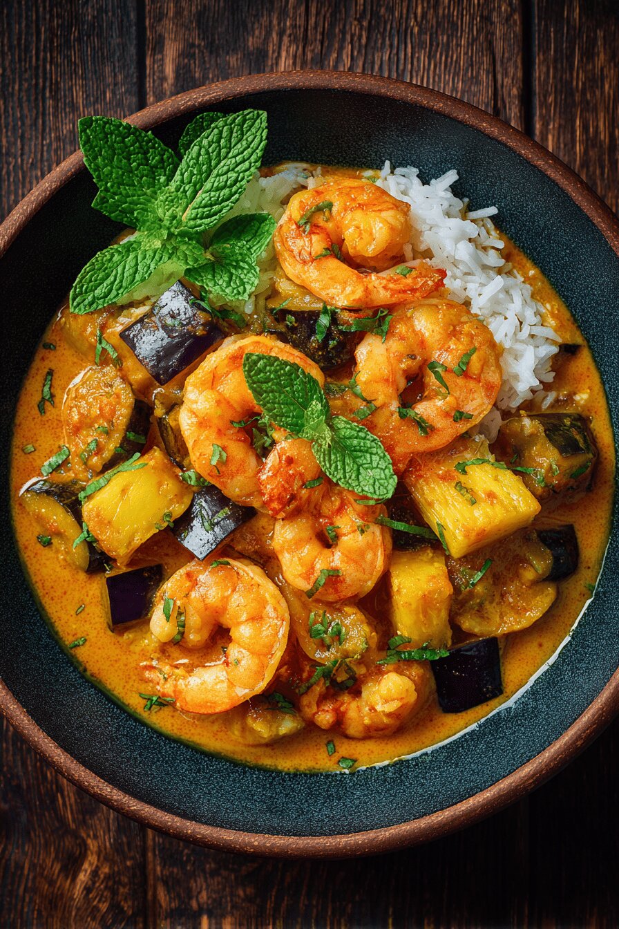 - 💡 Shrimp added late, don’t add early or become rubbery. Pineapple chunks tossed in with shrimp, stir carefully to coat without crushing. Heat just to gentle bubbling again, 5-6 minutes. Watch pink turning opaque, tails curling loosely. Shrimp shrinks fast once overcooked, toughens. Pineapple softens but should keep structure. Pull pan quickly. Squeeze lime juice last second, fresh zing—never cook lime or flavor dulls. Mint leaves lifted on top for herbal brightness, contrast. Cilantro optional, changes profile drastically.