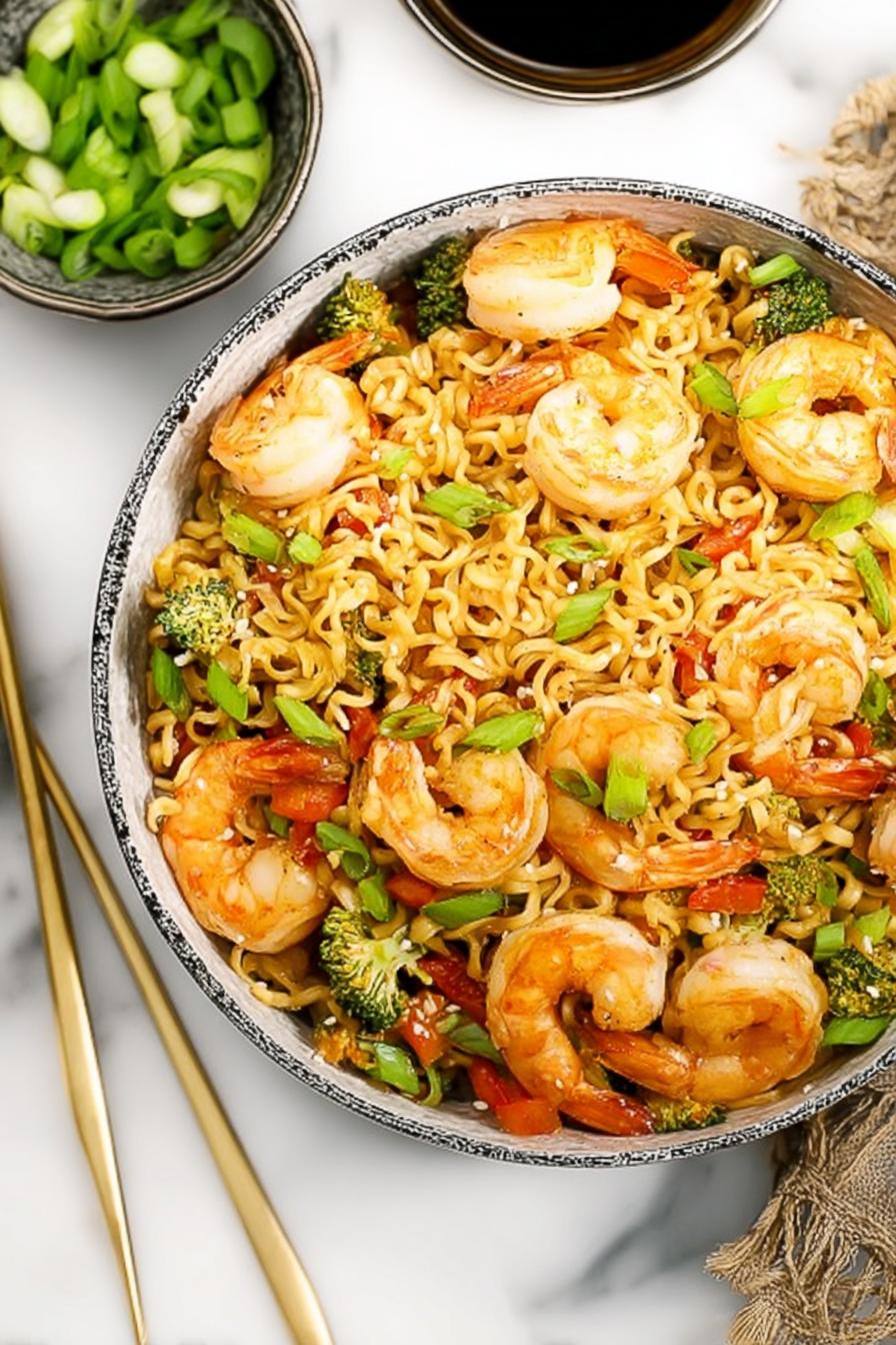 Shrimp and ramen, a marriage I kept tweaking. First times? Mushy noodles and tough shrimp — a nightmare. Learned fast, timing is everything. Noodles need to soften but not sag. Shocking under cold water stops starch, keeps strands loose. Shrimp? Cook them quick, hear that light sizzle, see them turn perfectly pink, and pull off immediately or risk leathery bite. The sauce — complex but balanced. I dumped generous garlic for punch, swapped grated garlic for ginger once to add zing. Sriracha? Not always, sometimes chili flakes for simmered heat. Tossed veggies bring color, texture, crunch — no limp bell peppers allowed. Toss everything gently to coat, steam some shrimp flavor in. Garnish with scallions and sesame for nuttiness and freshness. Quick pan, minimal mess, big taste. Cuts through busy nights with punch and aroma. You’ll find yourself sniffing the skillet just before serving — that savory, sweet, spicy swirl makes all the waiting worthwhile.