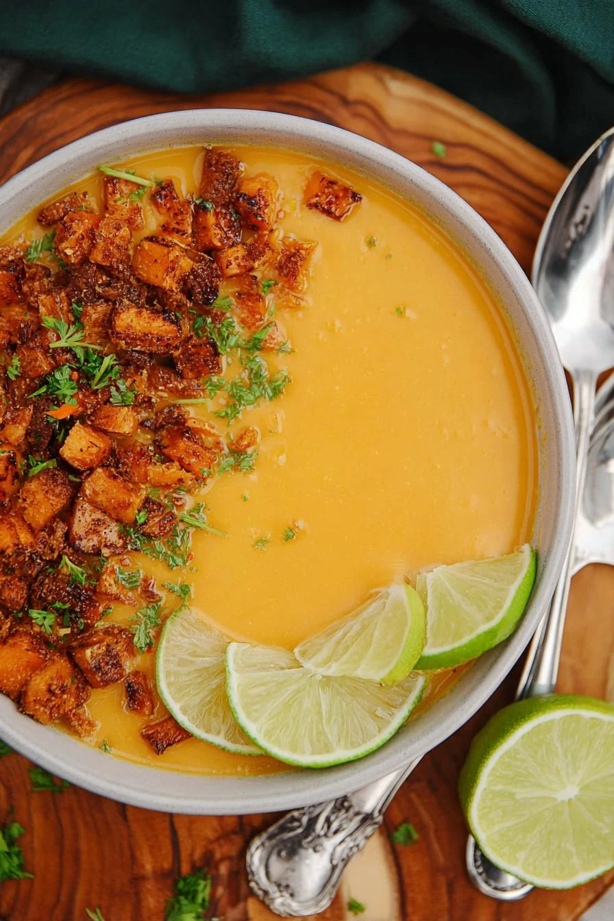 Three tablespoons of butter. Regular unsalted. Salted works if you cut back on salt later. One medium yellow onion diced—not minced, actual chunks. Garlic. Three cloves minced. One tablespoon of fresh ginger grated. The kind you peel, not the powder stuff. Four cups of sweet potatoes diced into one-inch cubes. Russets break down too much. Reds get mealy. Sweet potatoes actually stay whole-ish until you blend them. Four cups of vegetable broth. Chicken works. So does water if you’ve got nothing else. One tablespoon of chipotle chili powder. Not regular chili powder. Chipotle has smoke. Regular doesn’t. Eight ounces of Mexican chorizo. Casing removed. Half a cup of half and half. Or heavy cream if that’s what you’ve got. One teaspoon of smoked paprika. Lime wedges for the end. One tablespoon of fresh lime juice that goes in early. Not bottled. Fresh.