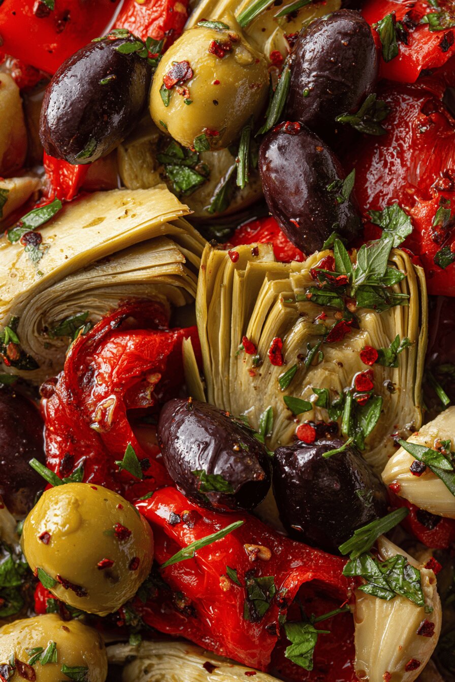 Combine olive oil with lemon juice and herbs first, this base brings all elements together. Toss the artichokes gently, avoid too much bruising to keep texture. Introduce the peppers and olives after coating with dressing, so they soak but maintain shape. Basil goes last to keep fragrance intact. Refrigerate loosely covered for faster marination; too long can soften veggies excessively. Serve cold or room temp to let oils bloom. Pairs well with crusty bread or alongside grilled meats. Adjust chili flakes carefully if sensitive, some like it smoky rather than fiery. Leftovers hold well, flavors intensify over time.