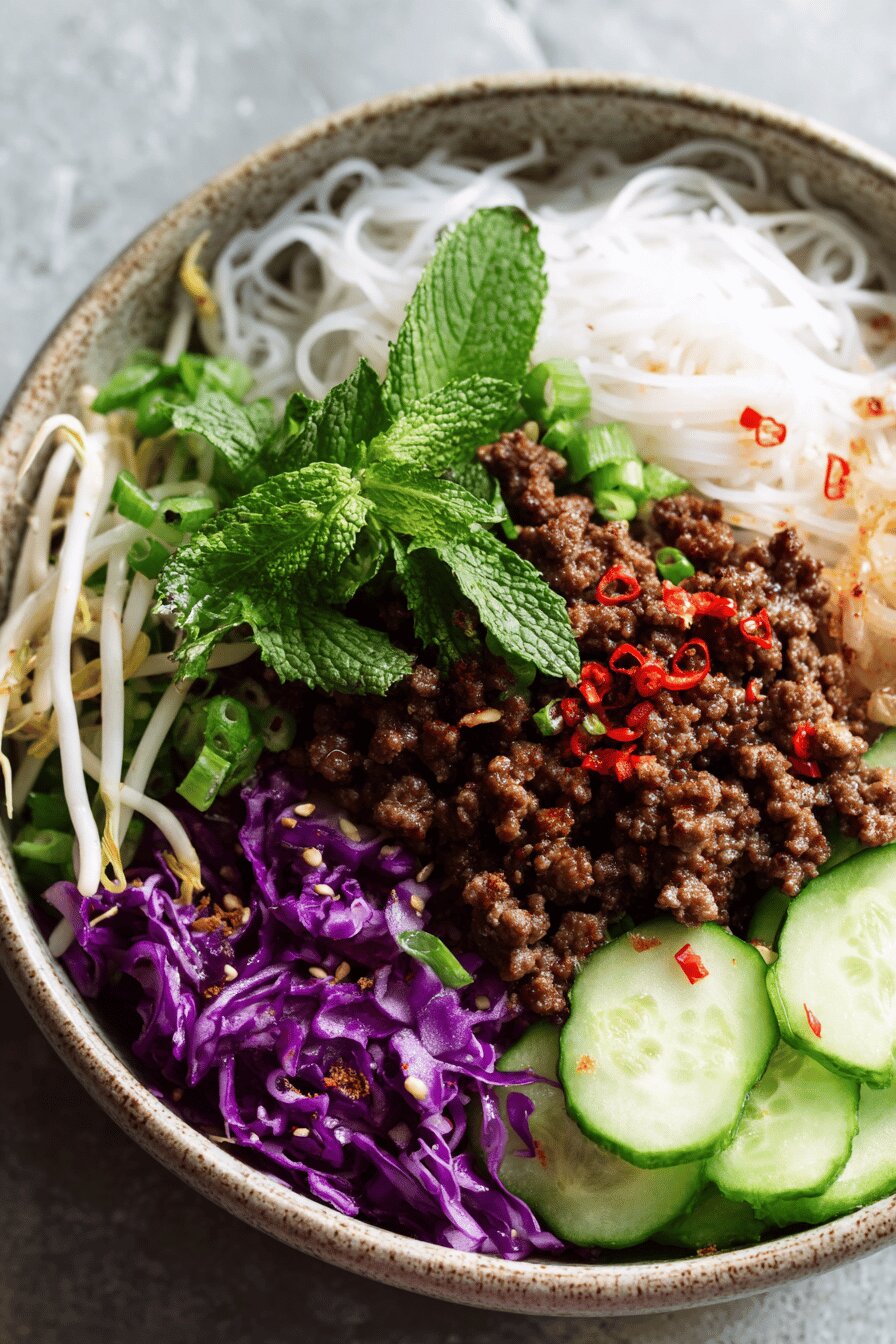 Lean ground beef cooked with ginger, lemongrass, garlic, and chilies. Rice vermicelli noodles soaked until tender. Crisp shredded purple cabbage, sliced Lebanese cucumbers, scallions, bean sprouts, fresh cilantro and mint leaves. Sauce made from soy, lime juice, fish sauce, brown sugar, and red curry paste. Ingredients rearranged and quantities adjusted. Chili flakes and toasted sesame oil swapped in for a twist. Quick to prepare with components combined for customized bowls by the diners.
