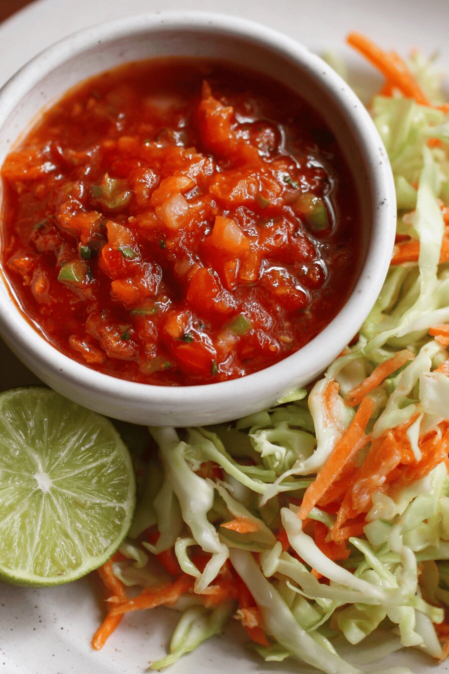 An altered version of salsa roja and curtido with reduced quantities by about 30%. Replaces chicken broth with vegetable broth and jalapeño with serrano pepper for a sharper heat. Adds a hint of smoked paprika in salsa and a squeeze of lime in slaw. Salsa simmers slightly longer for deeper flavor. Slaw macerates a bit longer for crunch and zest balance.