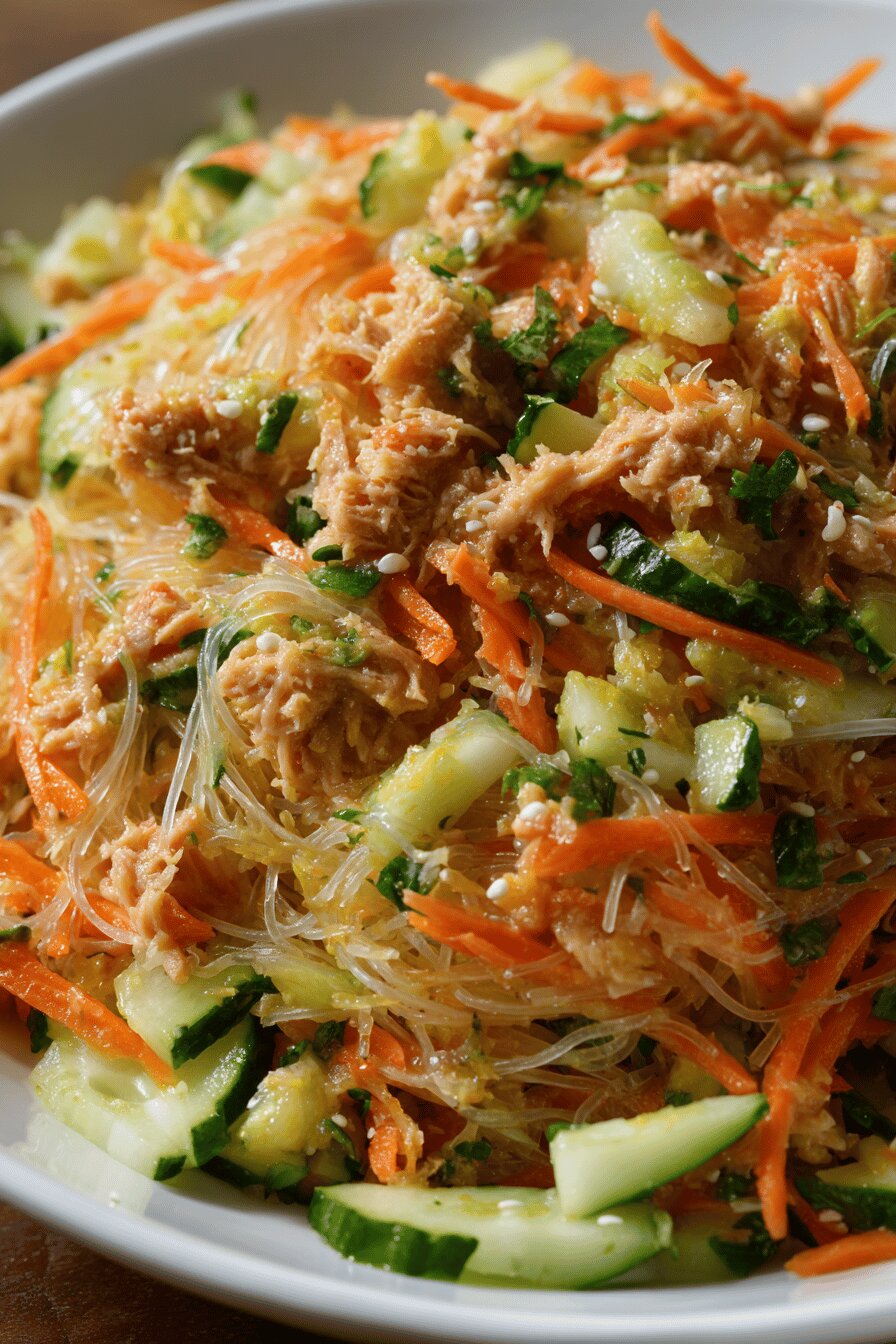 A chilled vermicelli salad tossed with a spicy tuna mixture and fresh vegetables. Quick soak vermicelli, mix with a zingy chili-tuna blend, shredded carrots, and diced cucumber. Light dressing with lime, garlic, and a hint of ginger adds brightness. No nuts, dairy, or gluten. Ready in under 40 minutes, serves 4 to 6.