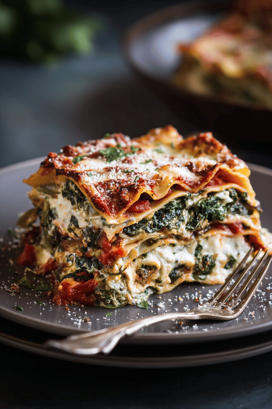 Ricotta and spinach layers in a homemade tomato sauce with oregano replaced by thyme, lasagna sheets swapped for whole wheat, finished with smoked gouda and pecorino cheeses instead of parmesan and mozzarella. Cream replaced by whole milk. Cook times shifted slightly to catch all bubbling and browning right. Added a touch of lemon zest to brighten the filling. Leaves you with a hearty, creamy yet slightly tangy bake. Vegetables wilted not mushy, sauce thick enough to cling but not drown. A bit rustic, a bit sharp. Works well frozen at the assembly stage. Ready for a weekend project or a weeknight rescue.
