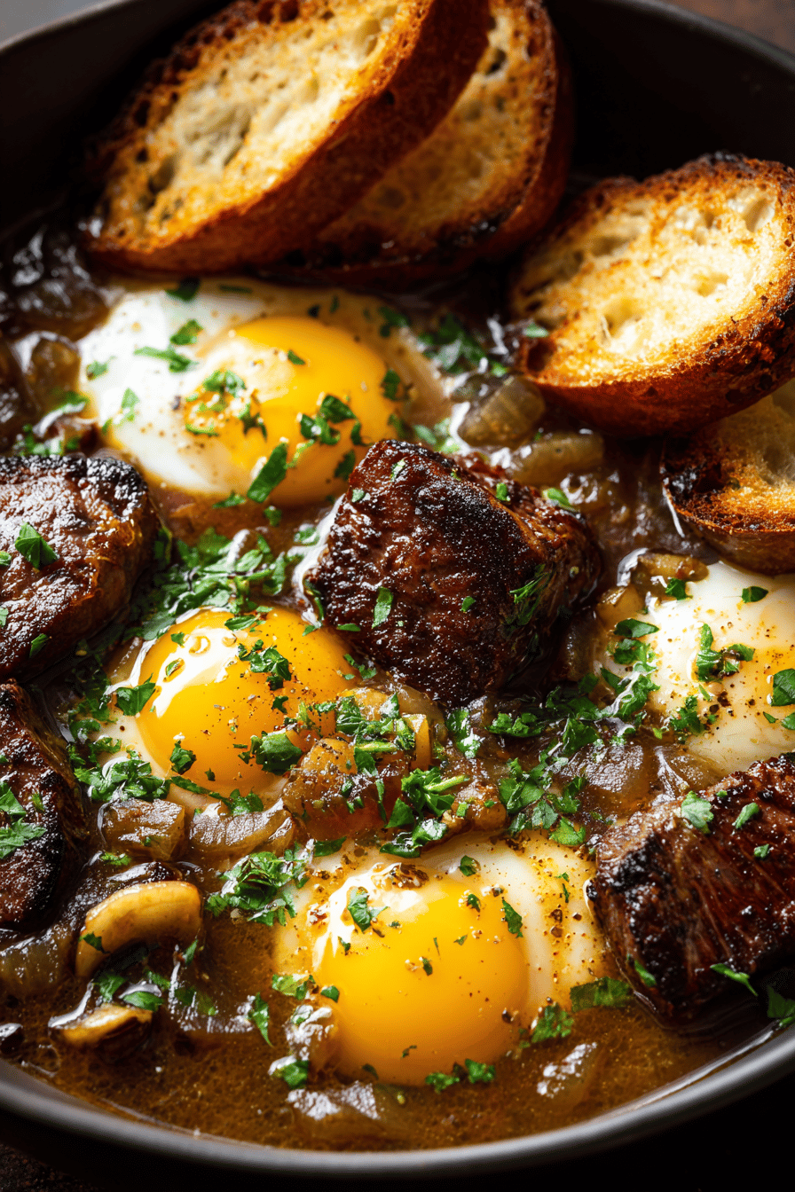 - 💡 Final assembly layered: soup base first, soup covers bowl bottom well. Toasted baguette rests on top – soak edges but stay crisp center. Thin sliced steak over bread. Egg on top. Sprinkle fresh thyme for herbaceous lift. Parsley can swap in for different aroma. Serve immediately. Bread can get soggy fast if sitting too long. Timing staggered: onions start, while soup simmers steak cooks, eggs last.