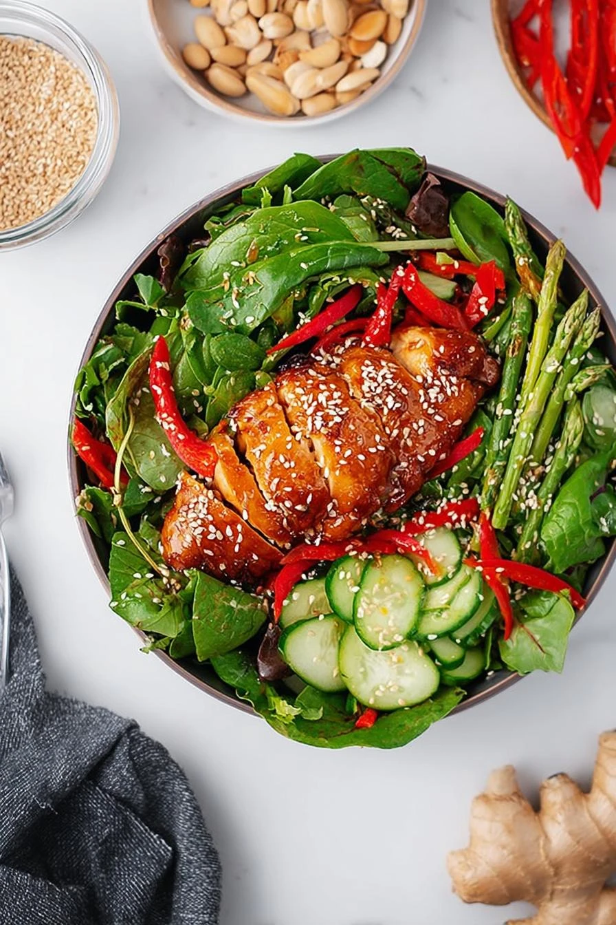- Build salad fast: lettuce leaves down, roasted red peppers bright and soft for sweetness, asparagus mixture for crunch and bite, then warm sliced chicken on top. Drizzle ginger dressing but sparingly; you want zing, not drowning. Sprinkle toasted sesame seeds last for nuttiness and texture contrast.