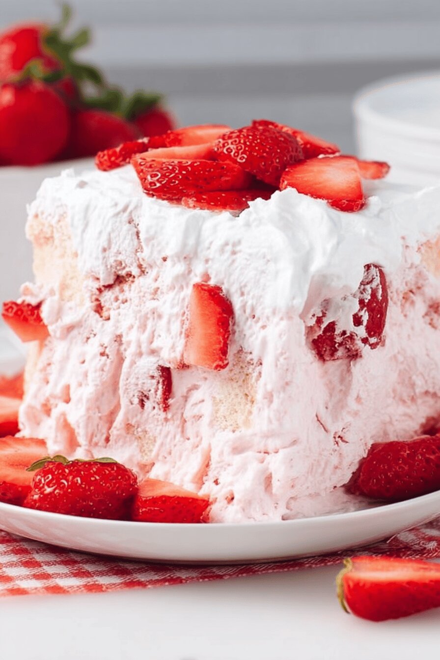 Gelatin crucial here; more or less changes texture dramatically. Cut back jello powder 5% if you want softer set; too much and it’s rubbery. Water measured just right here to dissolve powders fully yet not too diluted. Lemon juice optional but firm’s flavor profile. Vanilla extract added for subtle twist, adds balance to sweet strawberry notes. Whipped topping can be substituted by homemade whipped cream but watch for over-whipping or you’ll lose lightness. Fresh strawberries tossed in make a big difference compared to canned or frozen; frozen adds water ruining consistency. Angel food cake can be store-bought or homemade; stale cake works better than fresh because it absorbs moisture well but isn’t soggy. Don’t use yellow or chocolate cake; flavor clash too strong. If no angel food, pound cake works but heavier. Strawberries sliced thin for more even integration, chunky pieces risk uneven bites.