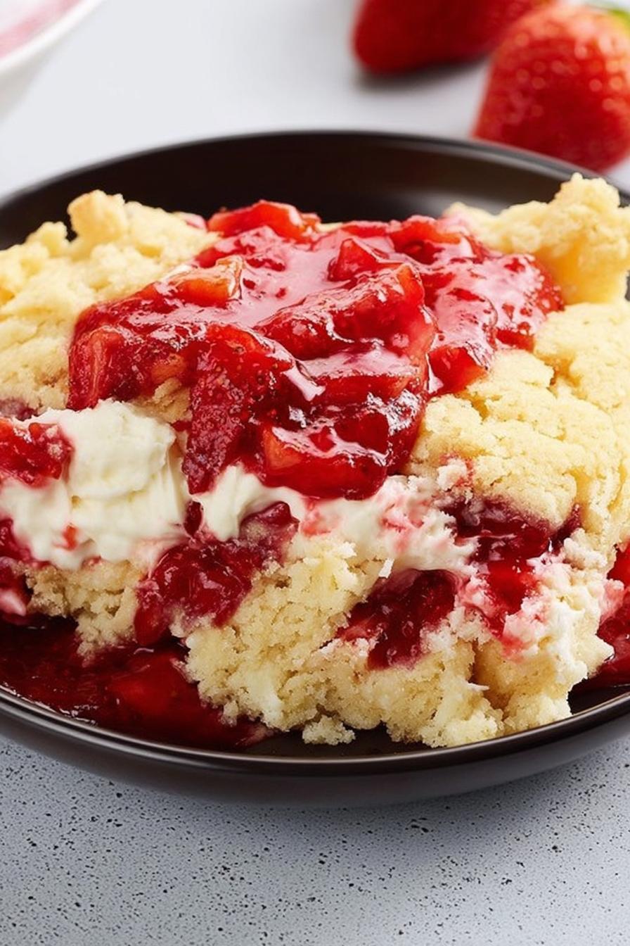 - Sprinkle dry cake mix evenly over cream cheese dollops and strawberry pie so it covers almost all surface.