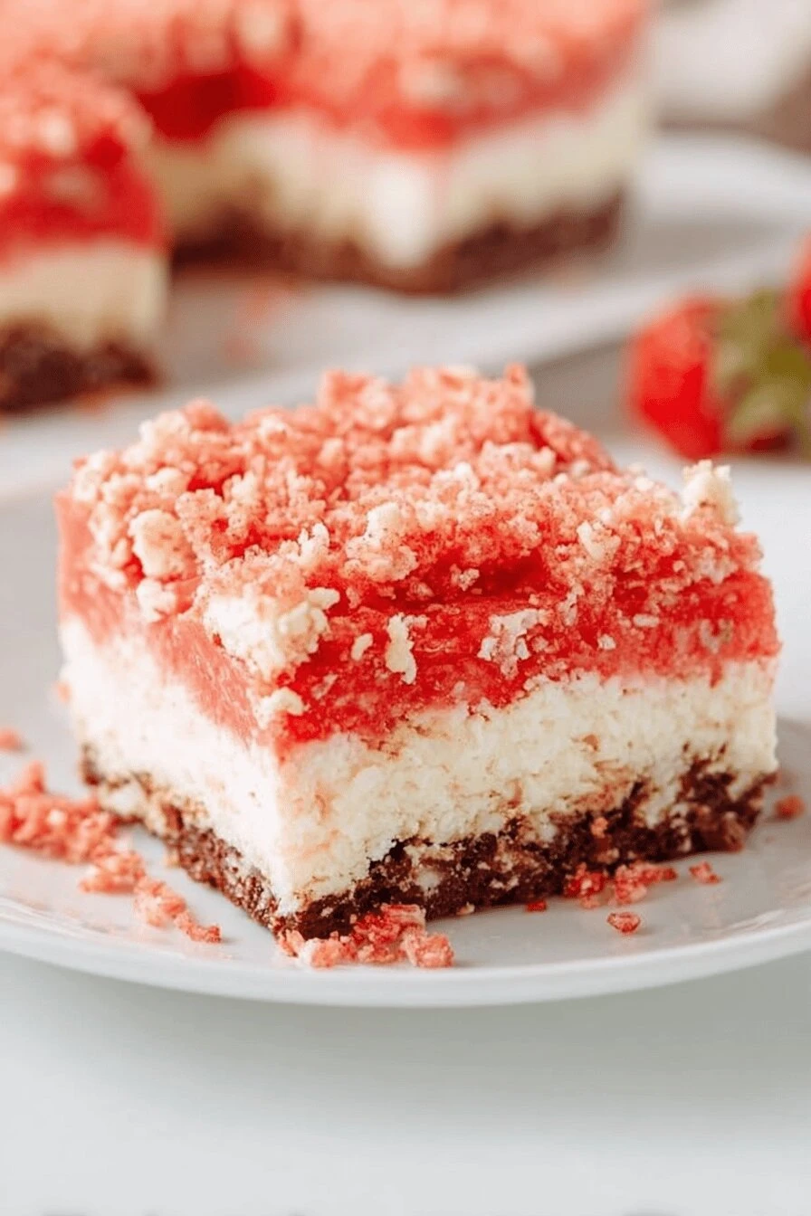 - 💡 Golden Oreos chosen for crunch and vanilla contrast; alternative graham crackers or Nilla wafers lose cookie depth but work if needed. Mixing remaining gelatin in topping adds tang but reducing gelatin lessens tartness if preferred. Batter thickness cues help timing; thick paste-like batter resists spreading; frosting pipes smoothly; topping crumbs sticky but chunky. Smell strawberry fragrance as baking signal; listen for crackling; watch edges pink gold. Don’t rely on clock; sensory signs better. Butter important for moist texture; oil can replace but no butter warmth. Eggs bind and leaven lightly; cake mix sugar adds crumb softness. Using white or vanilla cake mix changes berry punch; try for subtle tweaks.