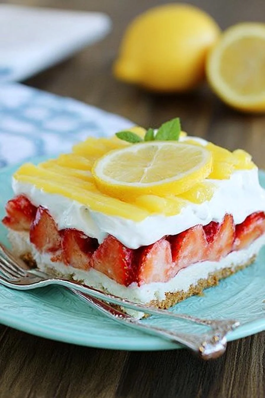 Takes 35 minutes of actual work. Rest is just waiting around. Strawberry and lemon hit different on a summer night—bright, not heavy, the kind of dessert that doesn’t sit in your stomach. No oven means your kitchen stays cool. Matters in July. Works cold straight from the fridge or sits at room temperature for a couple hours without falling apart. You can make this Thursday night and serve it Saturday. Flavors actually get better overnight—the crust absorbs moisture, everything melds together.