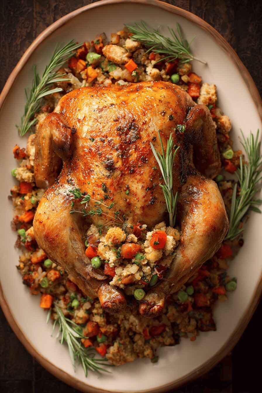 - Rest minimum 10 minutes. Juices redistribute; stuffing firms up inside chicken cavity. Cut cautiously so stuffing doesn’t spill but chicken stays juicy.