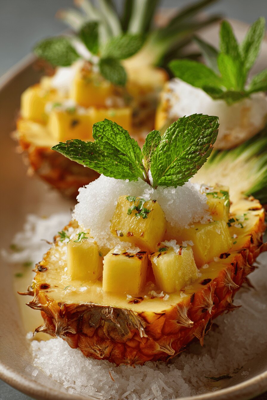 - 💡 Chop pineapple flesh into medium cubes. Too small turns mushy, too big hard to eat with granita flakes. Cubes should pop juicy but hold shape. Return to shell after hollowing for serving. This keeps juices in and presentation neat. Granita stays icy over cubes, layering textures contrast; juicy fruit, flaky ice, creamy sorbet.