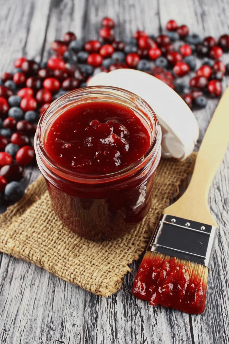 Smoky, fruity barbecue sauce combining dried ancho and chipotle chilis with tangy cranberries and fresh blueberries. Starts by rehydrating ancho pepper in hot coffee to extract deep, bitter notes and control heat. Onions softened in a hot pan bring sweetness and cut raw sharpness. Fruit and spices blended with reserved coffee and red wine simmered low and slow until thickened, syrupy edges scraped back in for full flavor. Use fresh or freeze portions. A versatile sauce with bold layers, balancing heat, acidity, and sweetness.