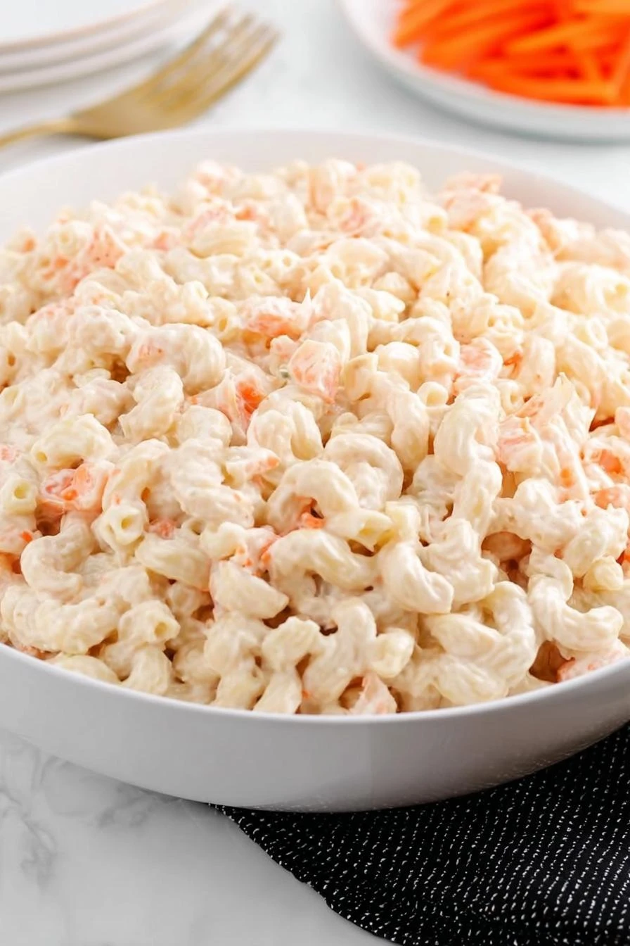 - Dump hot drained macaroni into a large bowl. Add shredded carrots, grated onion, apple cider vinegar, salt, and pepper. Stir gently but thoroughly. Let it rest uncovered 12 minutes or until steam fades and flavors hold.