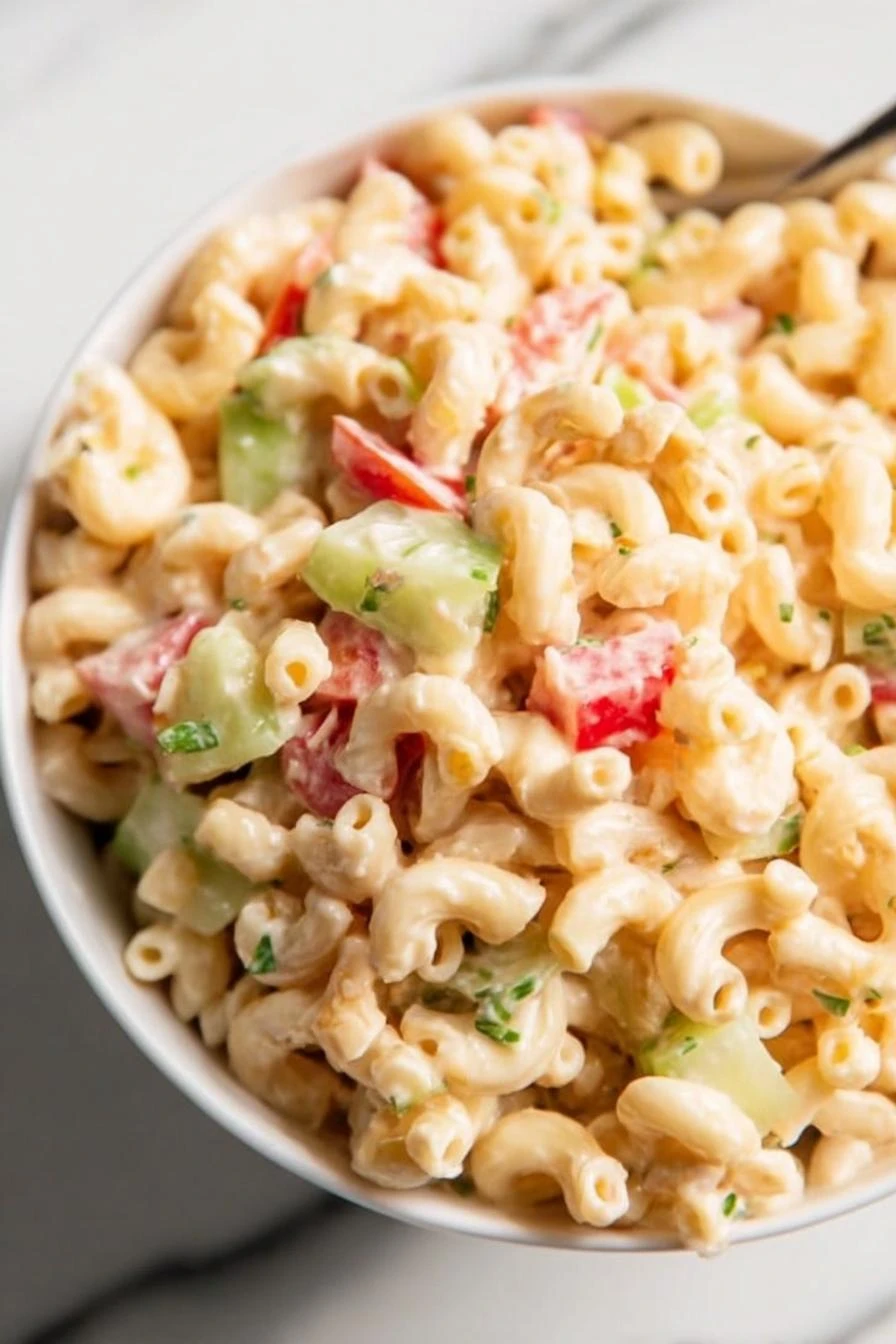 Can I make mac salad the night before? Yeah. Tastes fine. Just won’t be as crisp. The vegetables soften. The whole thing gets denser. It’s still good cold straight from the fridge. But same-day is better. If you have to make it ahead, save that dressing. Use it fresh right before serving. It brings back the life.