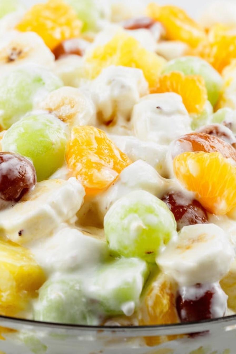 A tangy, creamy fruit salad with custard tossed among mixed fruit, marshmallows, and pecans. Pineapple and mandarin juices blended, thickened with eggs and cornstarch for a luscious custard folded with whipped cream. Bananas added carefully last to avoid mush. Chilled overnight to marry flavors and firm custard. Balanced sweetness, slight tang from lemon, and crunchy pecans create layers of texture and taste. Refreshing, not overly sweet, bespeaks a rehearsal of trial and error on custard thickness, fruit ratios, and timing.