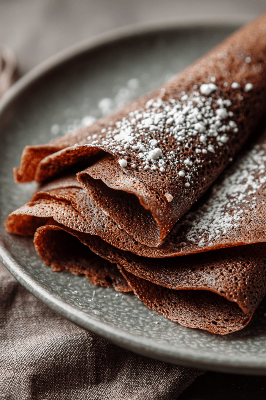Chocolate crepes. Thin, light, and flexible. Cocoa powder gives deep color, subtle bitterness. Swapping all-purpose with whole wheat adds slight texture, earthiness. Coconut sugar replaces refined, adding caramel hints. Lemon zest and vanilla lift flavors in subtle ways. Mix eggs with part milk first to avoid lumps. Gradually pour remaining milk to thin batter carefully. Melted butter in batter adds richness, silky texture. Cook on medium heat with butter brush to avoid sticking. Thin servings, around 45 ml per crepe, spread quickly. Flip sooner, less time on second side to keep tender. Rest in warm oven to keep ready without drying. Makes about 14 crepes, easy to stack or fill. Ideal for breakfast or light dinner. Quick hands make quick crepes, less wait, better texture. The slight tang from lemon zest disrupts cocoa’s heaviness, vanilla rounds off deep notes pleasantly. Perfect with fruit, whipped cream, or nut-free spreads. Enjoy layering flavors, crisp edges, softness.