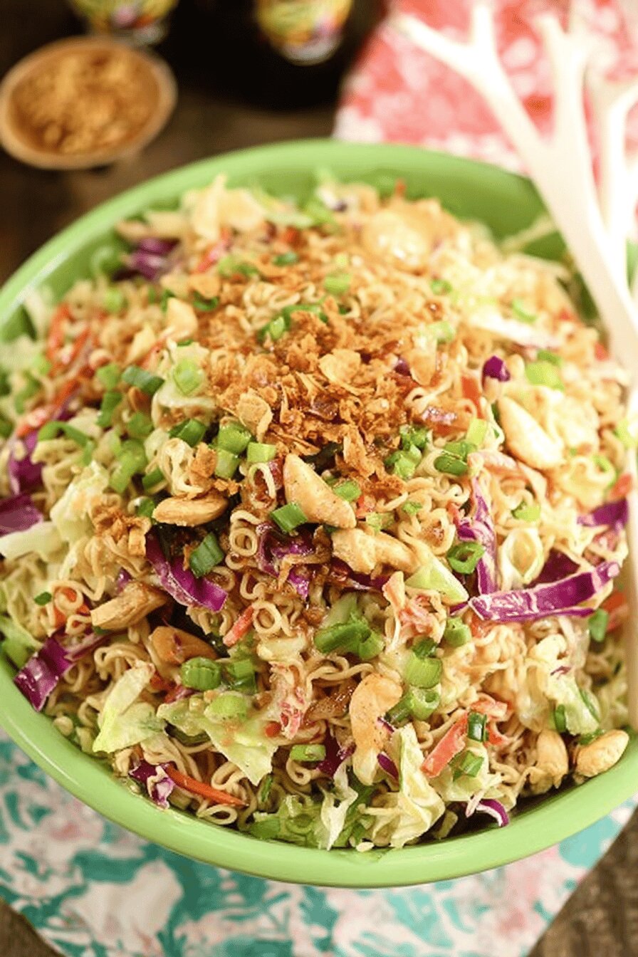 Crunchy shredded cabbage salad tossed with browned almond and crushed noodle bits coated in a tangy-salty dressing with a hint of toasted sugar. Uses less sugar and substitutes rice vinegar with apple cider vinegar for a sharper bite. Toasting the noodles to golden is crucial; listen for the faint sizzle and smell the nutty aroma. Toss immediately once cooled to keep slaw crisp. Green onions provide a fresh sharpness cutting through richness. Simple pantry staples bring the crunch and the punch. Serves 6 with about 350 calories a portion. Ready fast but tastes like you hustled all day.