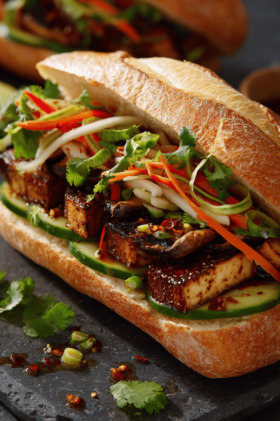 Sliced firm tofu paired with quartered shiitake mushrooms, both brushed and tossed in a blend of hoisin, chili garlic sauce, and Chinese five-spice powder, roasted until tender. Pickled carrot ribbons and crisp cucumber cut into fine julienne, layered inside a crunchy baguette spread with spicy mayo. Fresh coriander leaves, sliced green onion, and optional bird’s eye chili add brightness and heat. Vegan, nut-free, and dairy-free sandwich with a tangy-sweet crunch and robust umami flavors. Prep and active cook times balanced for a quick vegetarian main course.