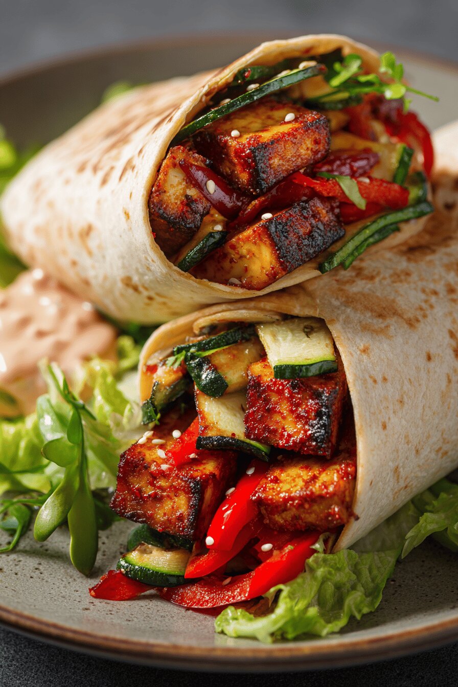 Tofu and veggies go charred and cool. Peppers blackened till skin curls and slides off. Tofu slices marinate sharp and sweet with lime and rice vinegar instead of mirin. Zucchini strips grill fast, soak smoky flavors. The mayo twist: sesame oil stirred in for nuttiness, taking place of plain mayo. Tortillas lay flat, waiting for the pileup. Lettuce shredded crisp. Wrap it all tight, fold ends, slice halves. Cool to eat or pack for on-the-go. Minimal fuss. Balanced bite. No nuts, no dairy. Crunch meets creamy, fresh meets smoky. The grill marks work twice - veggies and tofu. A quick, packed meal. Uncomplicated layers, bursting flavor contrast.