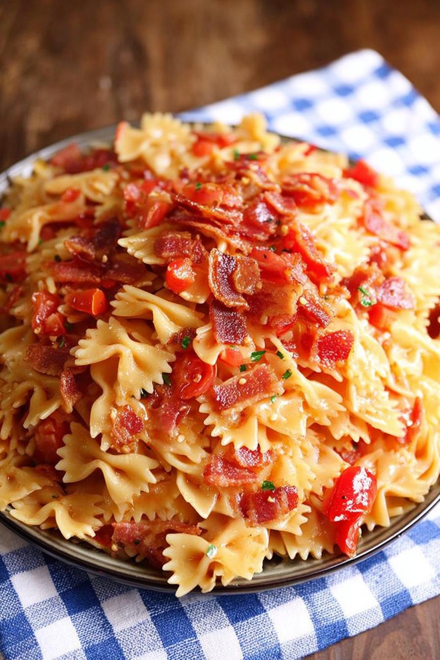 - 💡 Pasta cooked salter water; al dente crucial. Timing is eyeball, bite test. Too soft pasta turns mushy once sauced. Reserve splash pasta water for adjusting sauce consistency after tossing. Toss pasta hot, sauce thickens and binds with heat. Bacon bits tossed in last for texture contrasts.