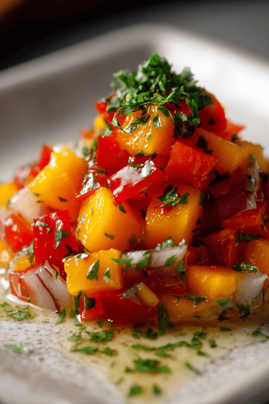 - 💡 Substitutions work but change mouthfeel and acidity. Sweet cherry tomatoes can replace bell pepper for color, less crunch. Rice or apple cider vinegar swap ok—modify quantity, acidity varies. Mango back in for sweeter, reduce vinegar to avoid overpower. Black pepper optional but adds bright bite, balances fruit sweetness.