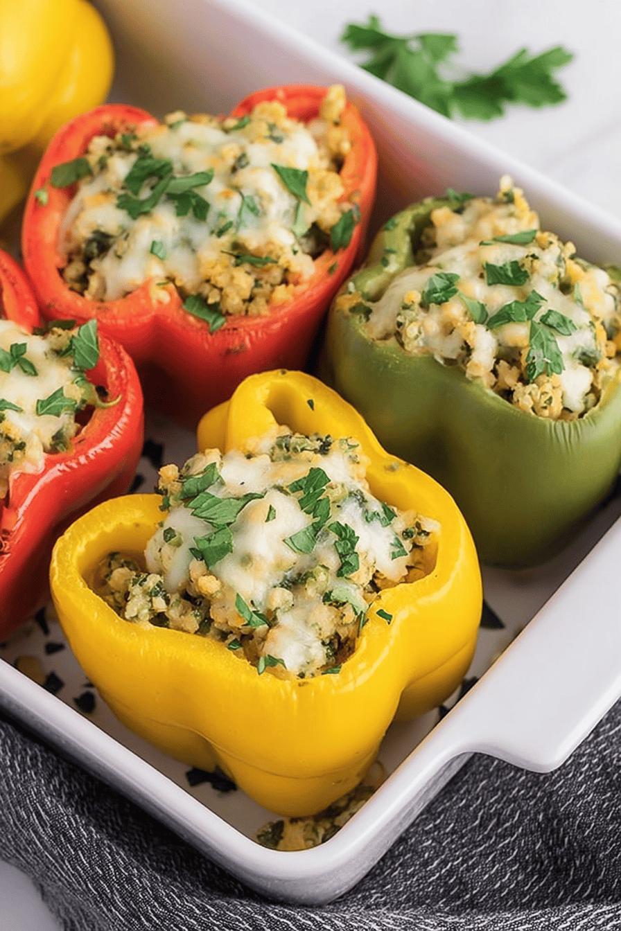 - Cover dish tightly with foil; traps steam cooks peppers through without drying filling. Bake around 20 minutes in 395°F oven. Watch firmness; peppers should hold shape and feel tender but not floppy when poked with fork.