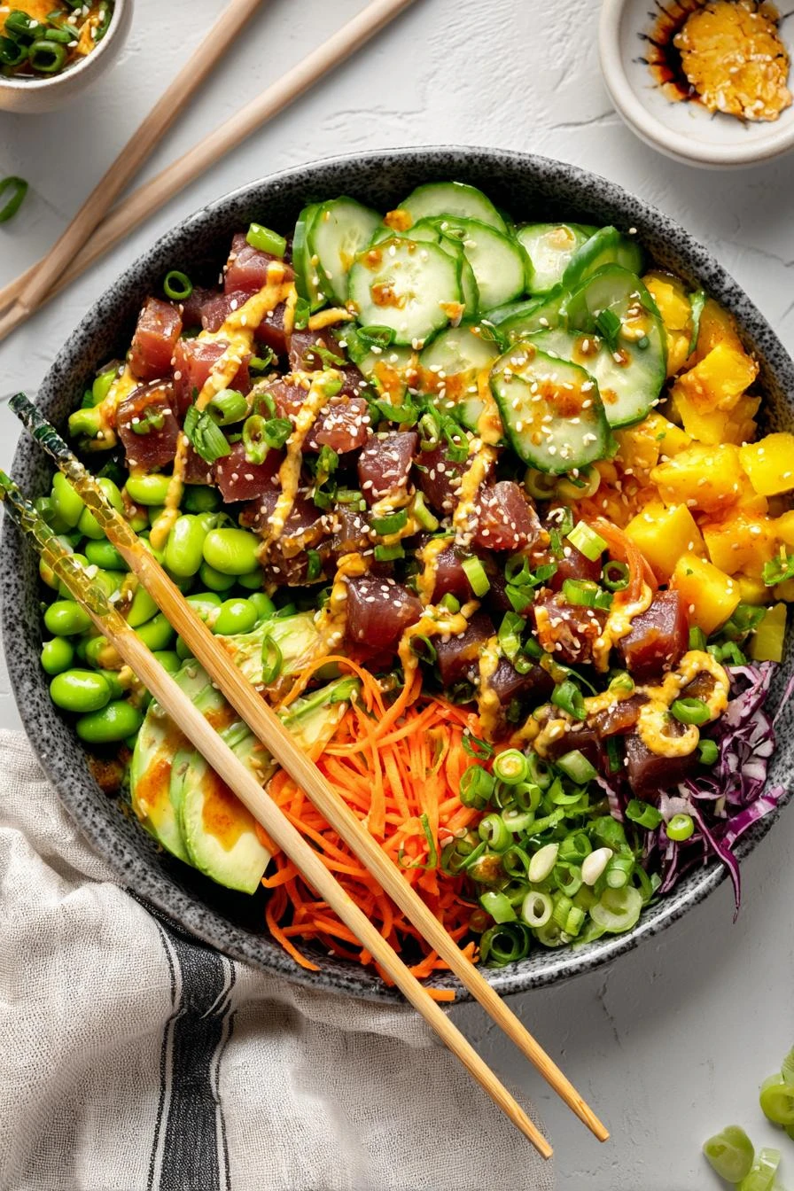 Slice the tuna into ¾ inch cubes. Sharp knife — clean cuts, not mush. The rice still steaming in the pot behind you, and you’re already mixing the sauce because that’s how this works. Fast. Twenty minutes total and you’re eating something that tastes like you flew to Honolulu for lunch.