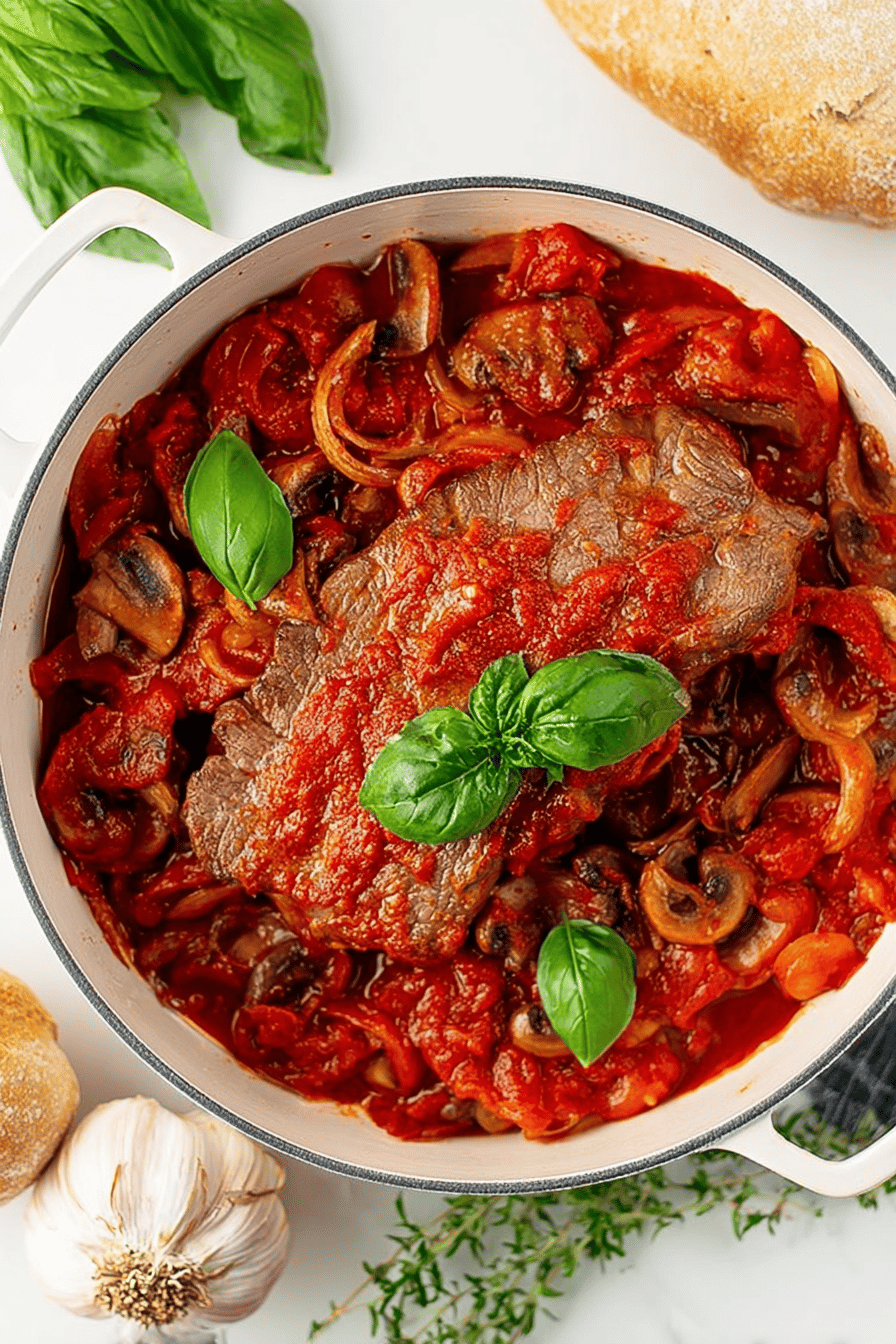 - 💡 Fresh herbs timing is everything. Oregano early if dried; releases flavors slowly. Parsley stir in just before plating; sharp green pop cuts cooked heaviness. Balsamic vinegar last splash—taste, then adjust acidity. Sauce bubbling gentle, no roar; too hot flattens tomatoes, herbs. Steaks back in low heat sauce absorbs without drowning or cooking to grey mush.
