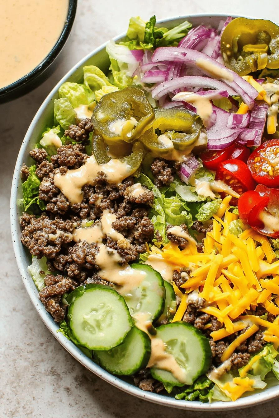 - 3 In large bowl add romaine, halved tomatoes, diced avocado, red onion slices, shredded cheddar, and chopped pickles. Toss gently if you like evenly dressed edges or keep components layered if you want intact bites. Top with warm seasoned beef. Sprinkle toasted sesame seeds for crunch and nuttiness. Serve with dressing on the side or drizzle and toss right before eating.