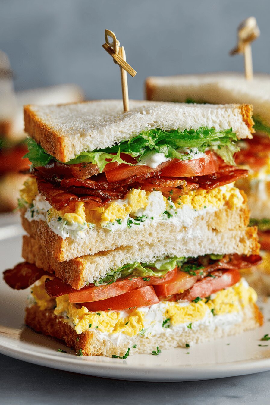 - To build each sandwich: bottom slice, layer egg piece, three bacon slices. Second slice of bread goes on top. Then three tomato slices, followed by two Boston lettuce leaves. Crown with the last bread slice pressed gently into place. Insert toothpicks at four corners to stabilize the stack, then slice diagonally into neat triangles. Repeat for all sandwiches.