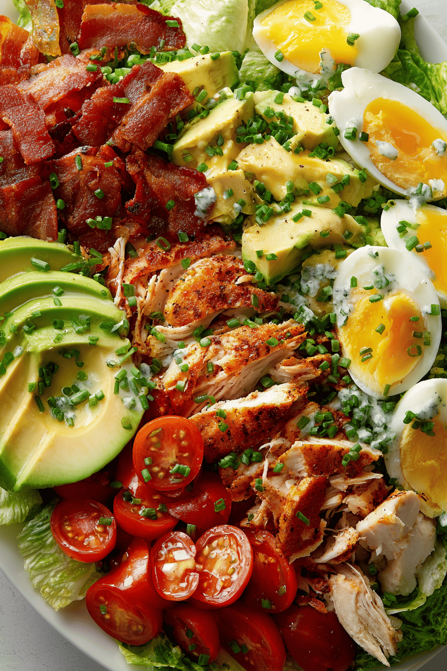 - 💡 Layering counts. Start with chicken in the middle. Next fresh romaine, then tomatoes, avocados side by side. Place everything thoughtfully. Keep lettuce crisp outside. Egg halves scattered for natural look. Final touch - bacon bits. Make them pop on top.