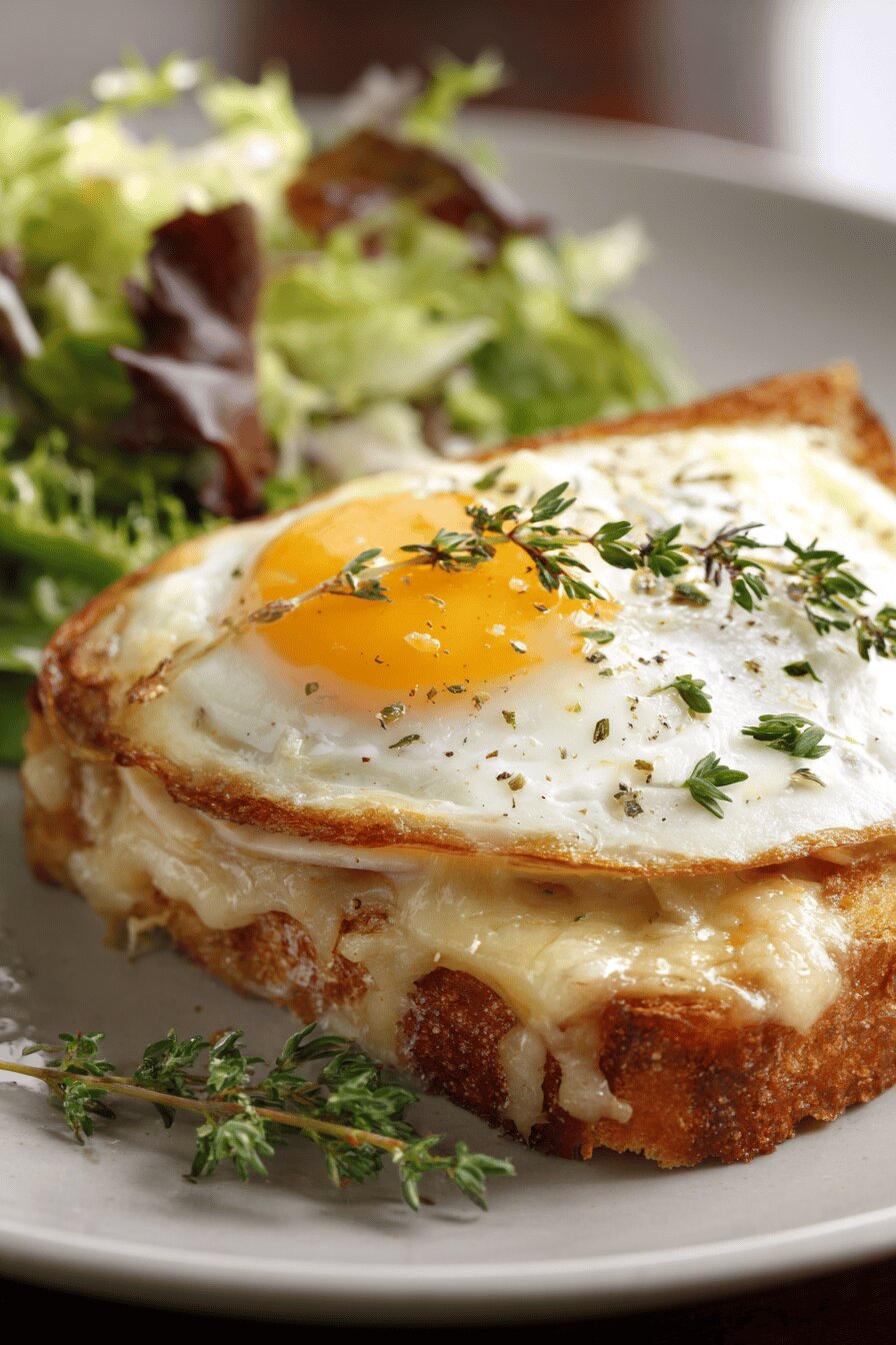 A creamy béchamel with shallot and smoked gouda under toasted sourdough. Layers of turkey instead of traditional ham, topped with a sunny-side egg fried in olive oil and a hint of thyme. Baked until golden, cheese melted. A fresh green salad with a zesty apple-dijon vinaigrette on the side. Nourishing French-style open sandwich with a subtle smoky twist and herb aroma. Quick to assemble, modest oven baking. Protein rich, comforting midweek meal.