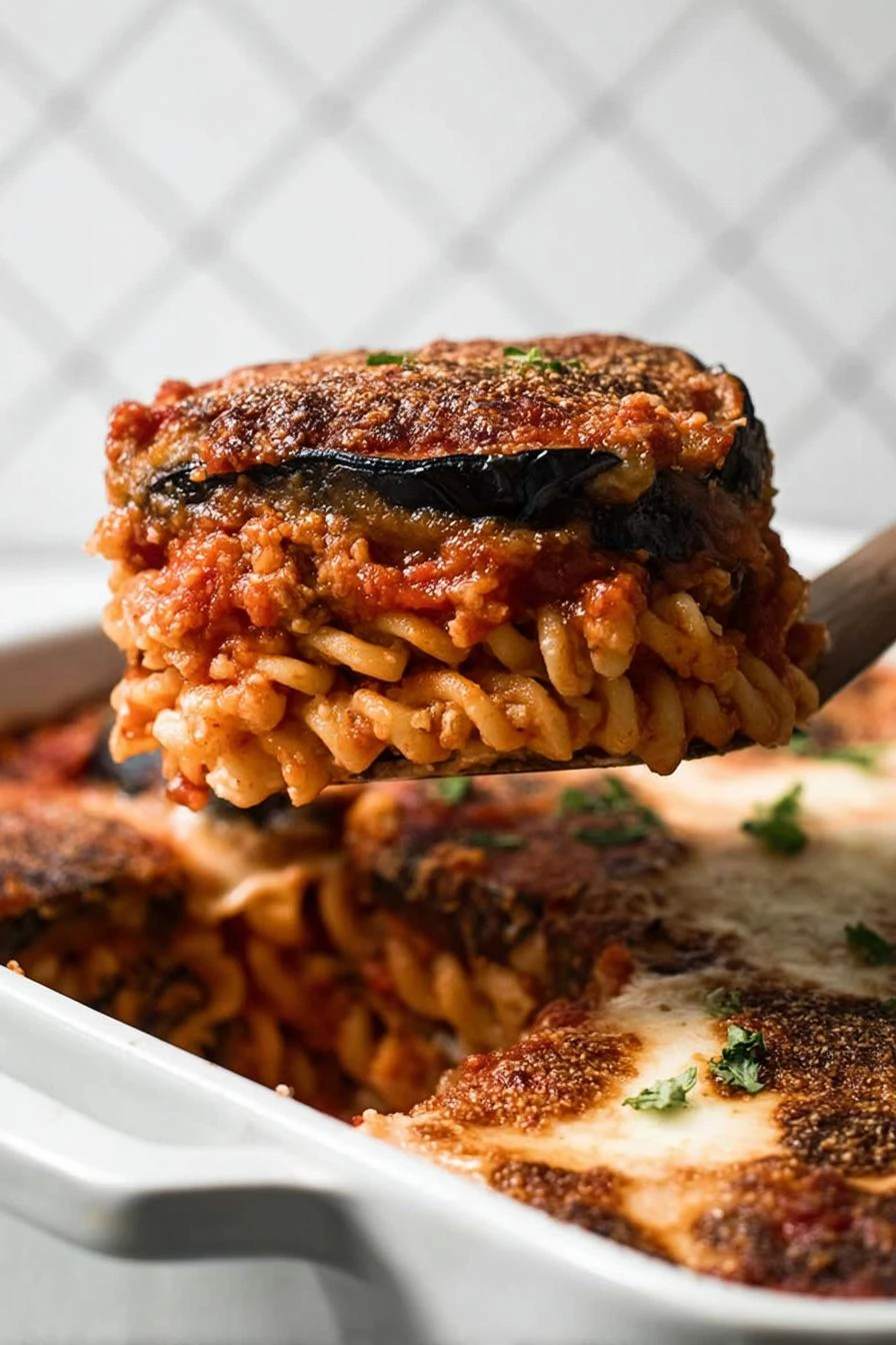 - 💡 Cook pasta al dente; drain, toss lightly with olive oil so noodles don’t stick before layering. Hollow rigatoni or penne catch sauce better than spaghetti here. Pasta texture must hold under sauce and eggplant layers without getting mushy.