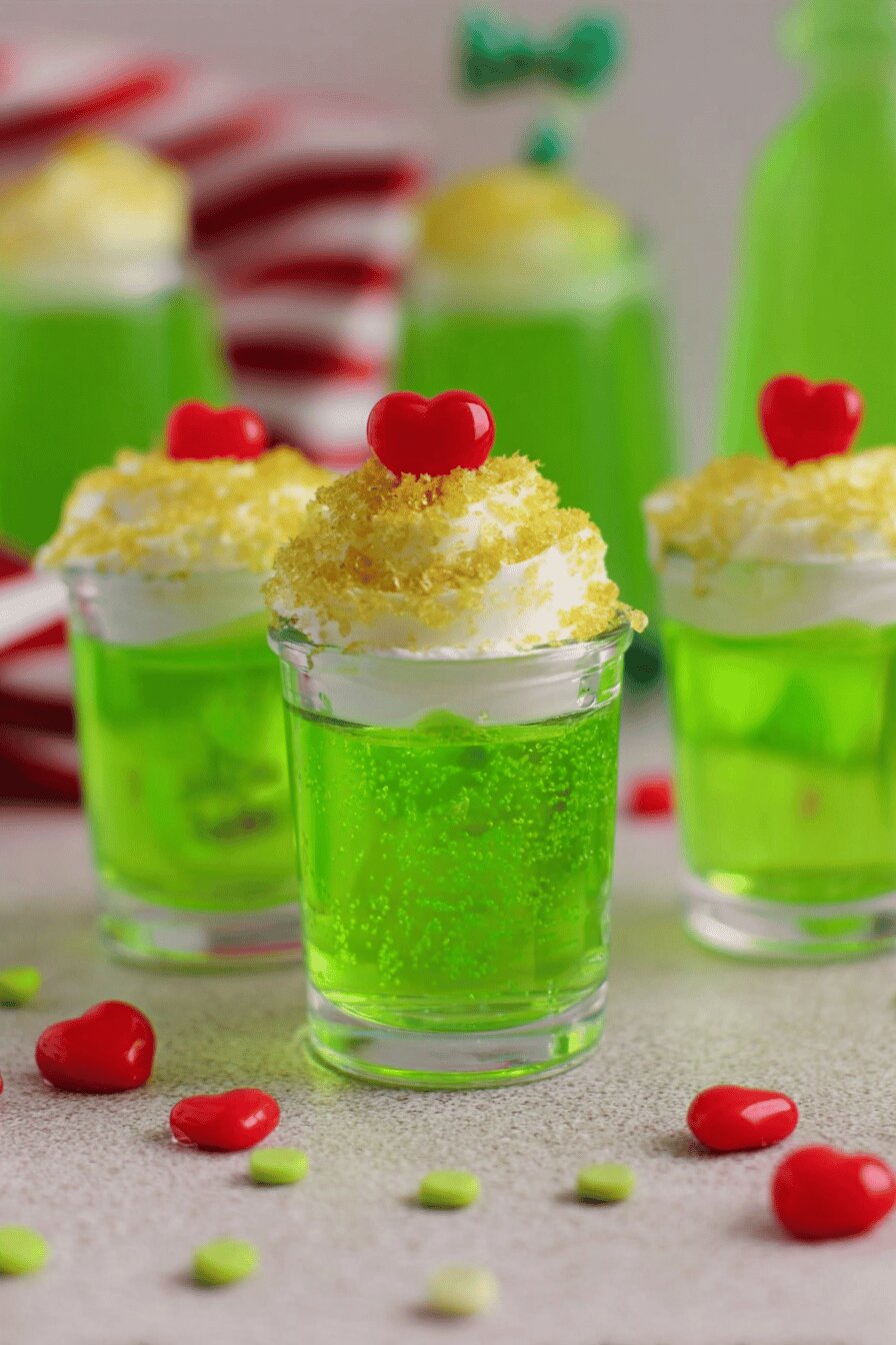 - Strain carefully into rimmed glasses. Watch the splash, catch that green contrast against speckled rim. Immediately drop one cherry into each shot. Cherry sinks slowly. Juicy burst locked inside.