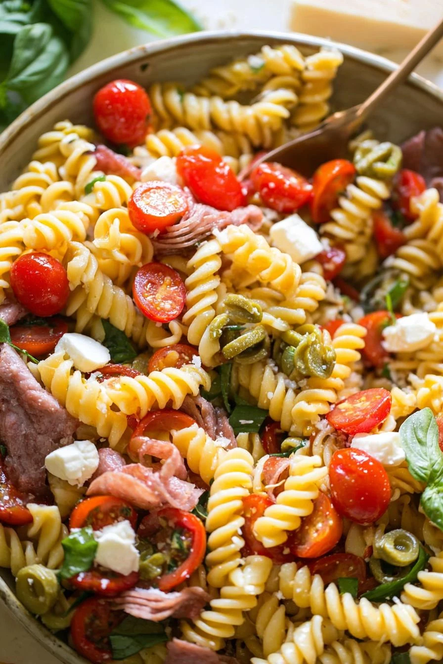 Don’t use hot pasta. Cold pasta. This is non-negotiable. Hot pasta drinks dressing and falls apart. Cold pasta holds its shape and the dressing coats instead of soaks in.