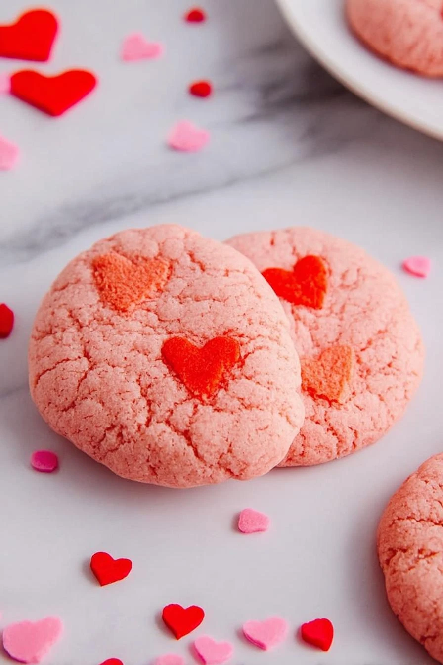 Pull them out. Immediately—while they’re hot—press one candy heart gently into the center of each cookie. The warmth helps them stick without sliding around or melting into nothing. Let them cool on the sheet for 7 to 10 minutes. Then move them to a wire rack. If you leave them on the sheet too long, the bottom gets soggy.
