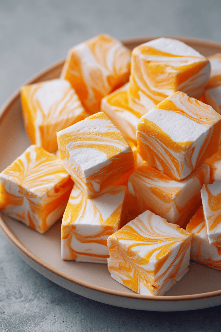- Reserved orange syrup—take 60 ml (1/4 cup) and fold into marshmallow gently with spatula, aim for marbled swirls rather than full mixing. Bright streaks visible.