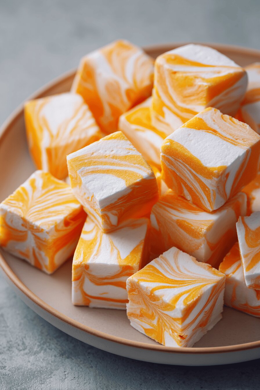 - 💡 Coloring happens off heat, fold in gently after syrup melts. Lemon yellow gel needed if adding vibrance. Avoid boiling with color, breakdown dulls pigment. When folding orange syrup into marshmallow, fold slowly, gentle swirl creates visual streaks. Overmix and colors blend into single shade, losing marbled effect. Use a skewer for patterns, fine lines. Oiled pan and plastic wrap prevent nightmare sticking. Oil knife before cutting; sticky marshmallow gums up blade.