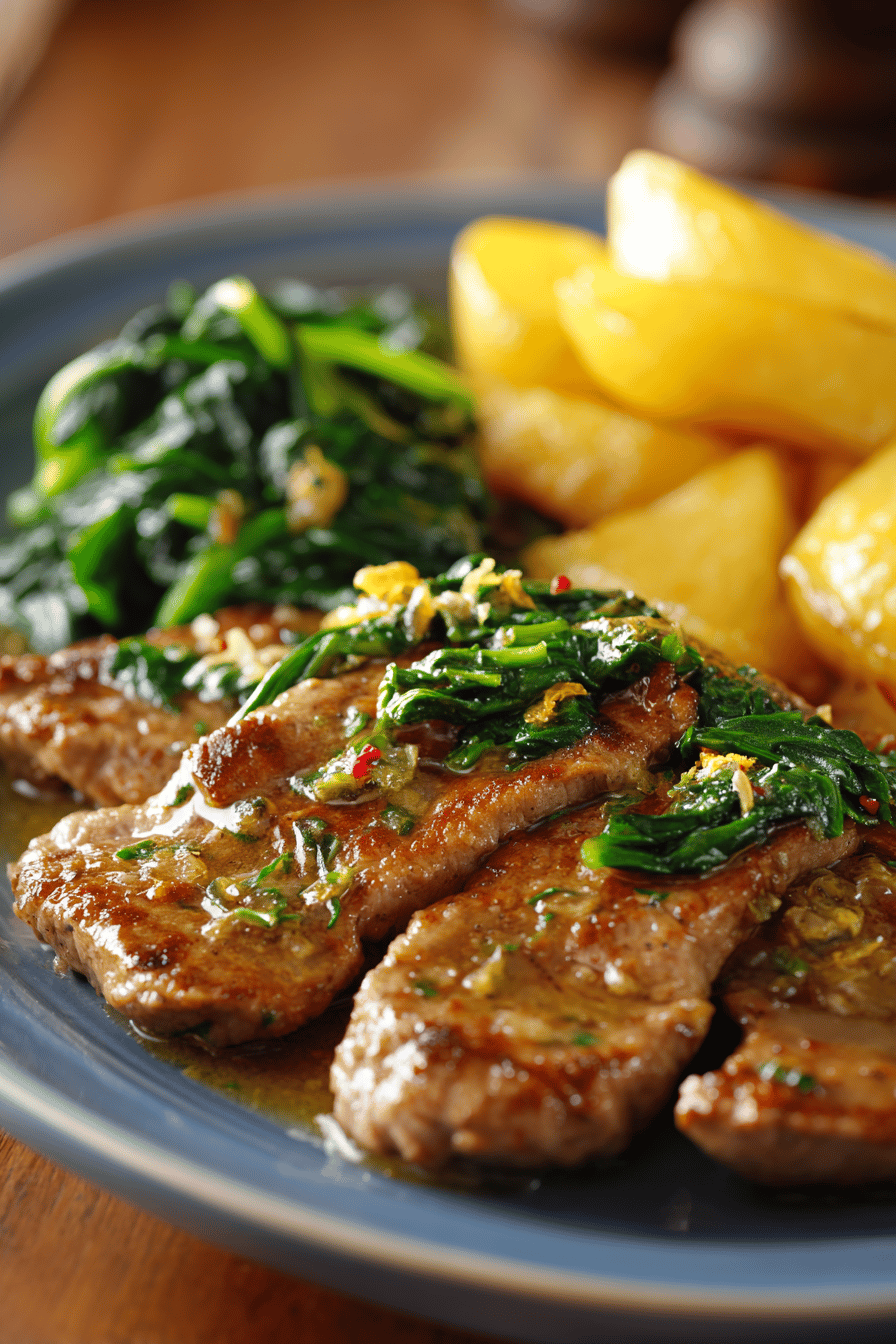 Wilt spinach on high heat quickly, not stewing, just tossing so water evaporates fast. Garlic added first to infuse oil but watch for browning. Pecorino folded in off heat to avoid clumping or cooking away. Lemon zest last to keep brightness fresh. Escalopes coated lightly with flour-cornstarch mix to avoid thick batter. Use medium-high heat to get color without overcooking veal. Sauce made by deglazing pan after searing, scraping up those fond bits. Reduce liquid by half over medium; higher heat speeds evaporation but watch so it doesn’t burn. Off heat, butter whisked in to emulsify and thicken sauce immediately. Season at end because reduction concentrates salt. Serve immediately to keep sauce glossy and warm. Potatoes are optional but match sauce and spinach well if using.