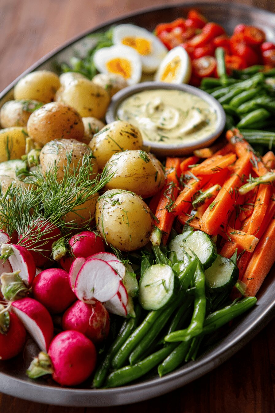 Egg yolk creates the base for the aioli, emulsifying the oil and lemon into a creamy texture. Dijon adds a spark, cutting richness and balancing garlic’s bite. Canola oil chosen for neutral flavor but olive oil works if you prefer more fruitiness. Using smaller potatoes ensures quicker cooking and even texture. Carrots provide a natural sweetness, softened but not mushy. Haricots verts add a fresh green crunch and color pop. Mixing boiled vegetables with raw keeps the platter visually and texturally dynamic. Hard-boiled eggs add protein and creaminess making this more substantial. Salt in the cooking water seasons veggies from the inside out, but be cautious not to oversalt the aioli.