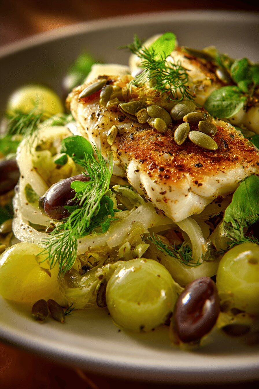 - 💡 Green grapes cut in halves. Release juice but keep shape. Fresh and sweet grapes needed. Adds juicy pop against crunchy fennel. Use lettuce as mild, crisp green like romaine, butter lettuce. Keeps salad light, no bitter greens. Toss herbs and greens lightly before dressing to keep textures distinct.